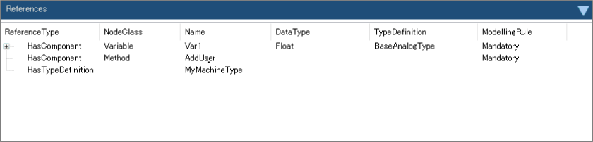 ReferencesエリアはAttributesエリアと異なり表示のみでデータの変更は出来ません。Parent NodeとTargetNodeの関連を示すエリアです。Object NodeがAddressSpaceエリアで選択された場合のReferencesエリアの表示について説明します。